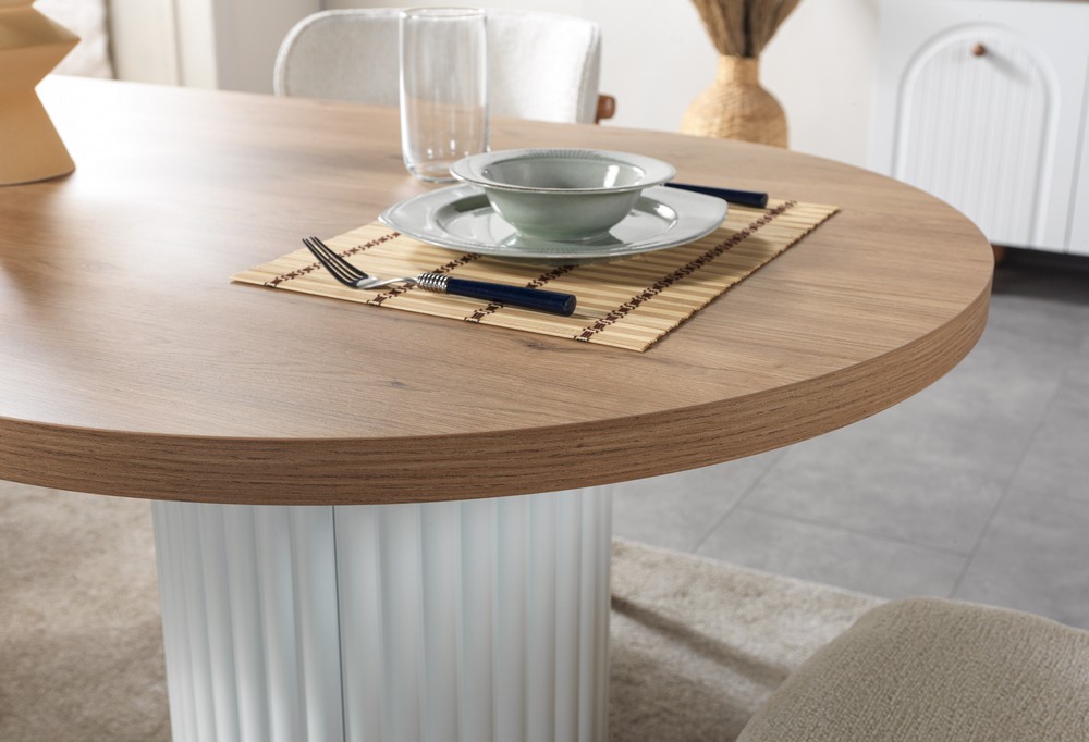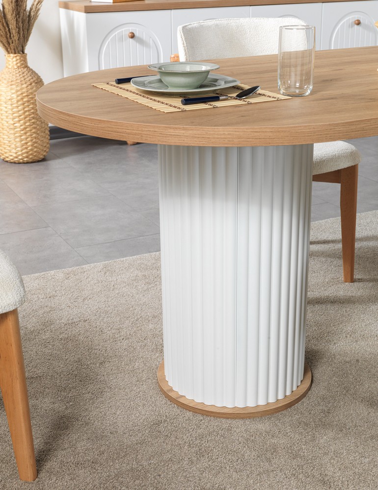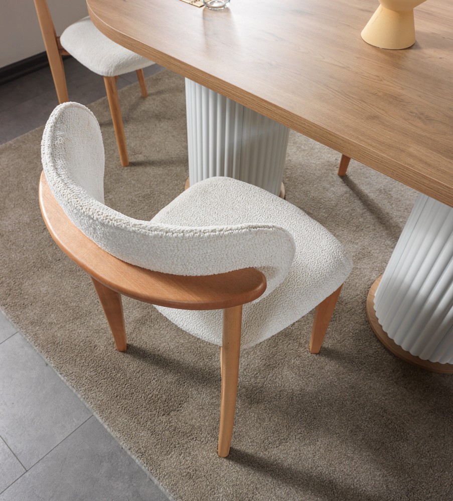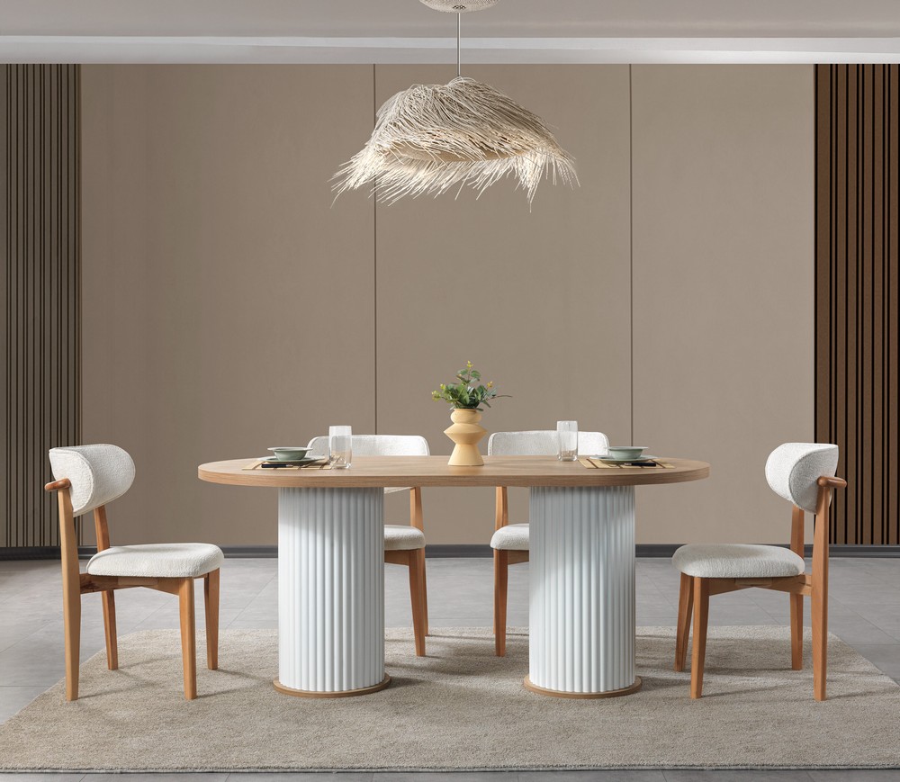 Doğal dokuların sıcaklığı ve bohem stilin özgür ruhu bu sabit masa tasarımında buluşuyor. Masif ahşap görünümü, yumuşak geçişli hatları ve sağlam yapısıyla uzun ömürlü kullanım sunar. Sabit masa formu sayesinde dengeli ve güçlü bir duruş sergilerken, geniş yüzeyi kalabalık sofralar için ideal konfor sağlar. Bohem yaşam tarzını yansıtan bu tasarım, yemek alanlarına samimi ve estetik bir atmosfer kazandırır.