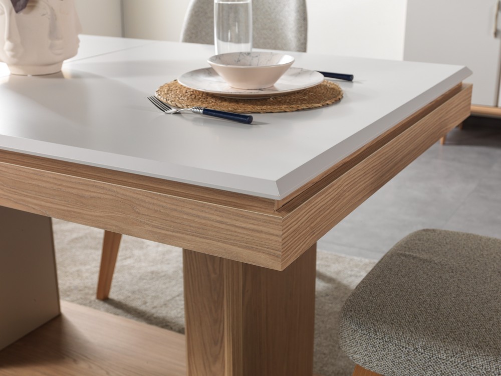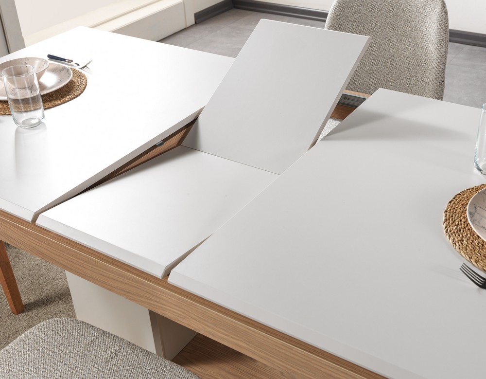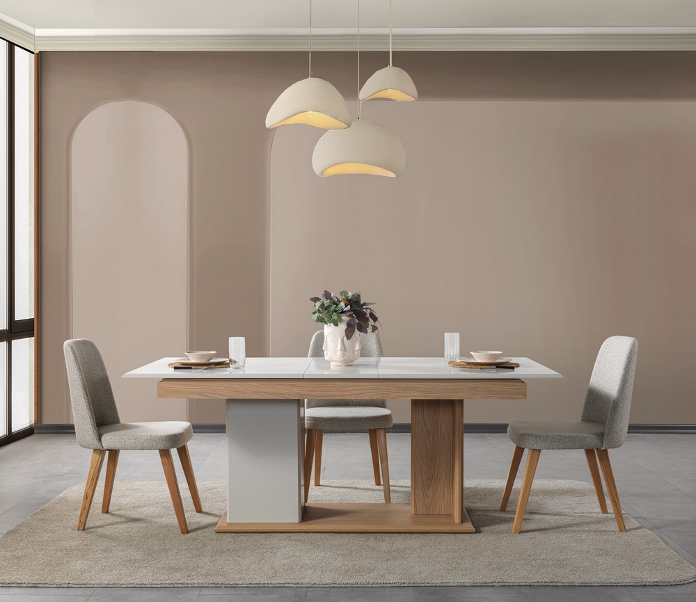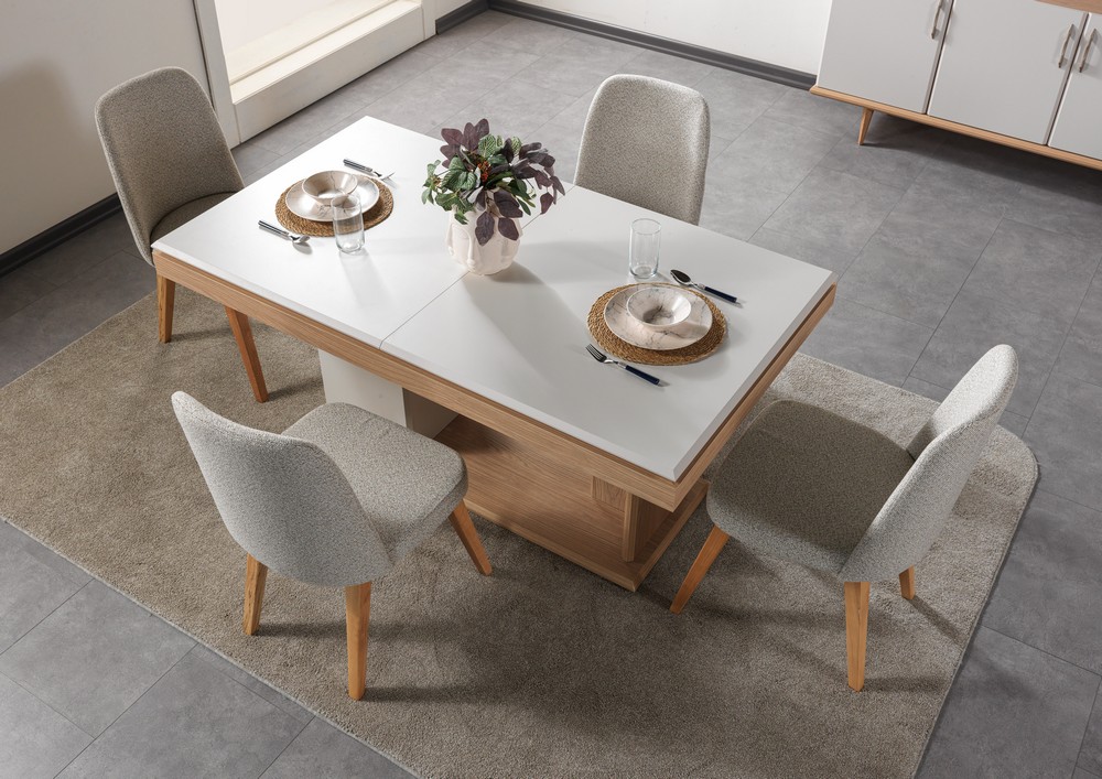 Doğal dokuların sıcaklığı  özgür ruhu bu açılır masa tasarımında buluşuyor. Masif ahşap görünümü, yumuşak geçişli hatları ve sağlam yapısıyla uzun ömürlü kullanım sunar. Açılır  masa formu geniş yüzeyi kalabalık sofralar için ideal konfor sağlar.Yaşam tarzını yansıtan bu tasarım, yemek alanlarına samimi ve estetik bir atmosfer kazandırır.