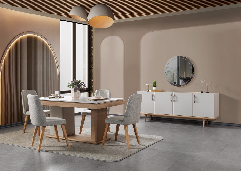 KL-CEMRE YEMEK ODASI Doğal dokuların sıcaklığı  özgür ruhu bu açılır masa tasarımında buluşuyor. Masif ahşap görünümü, yumuşak geçişli hatları ve sağlam yapısıyla uzun ömürlü kullanım sunar. Açılır  masa formu geniş yüzeyi kalabalık sofralar için ideal konfor sağlar.Yaşam tarzını yansıtan bu tasarım, yemek alanlarına samimi ve estetik bir atmosfer kazandırır.